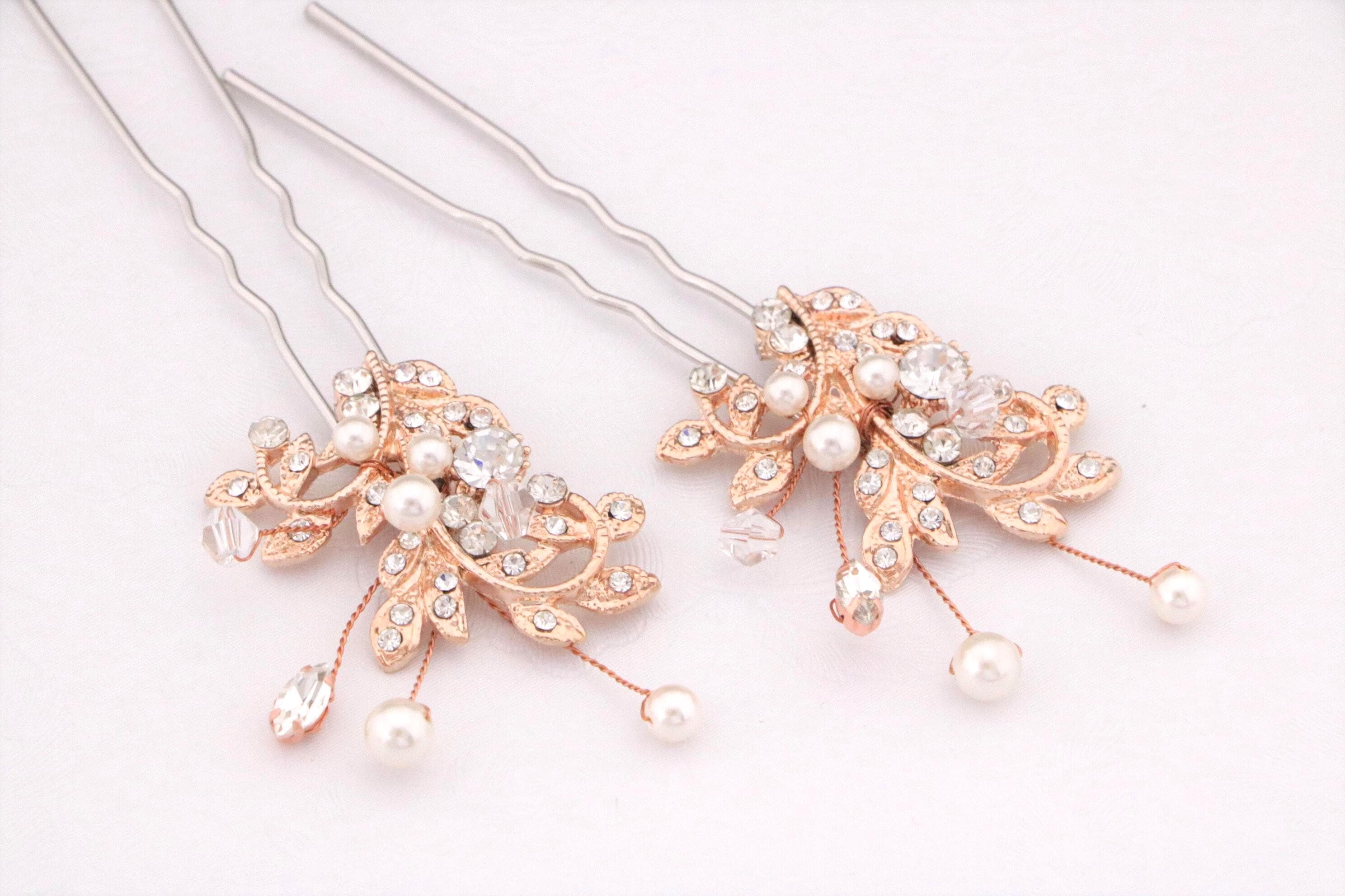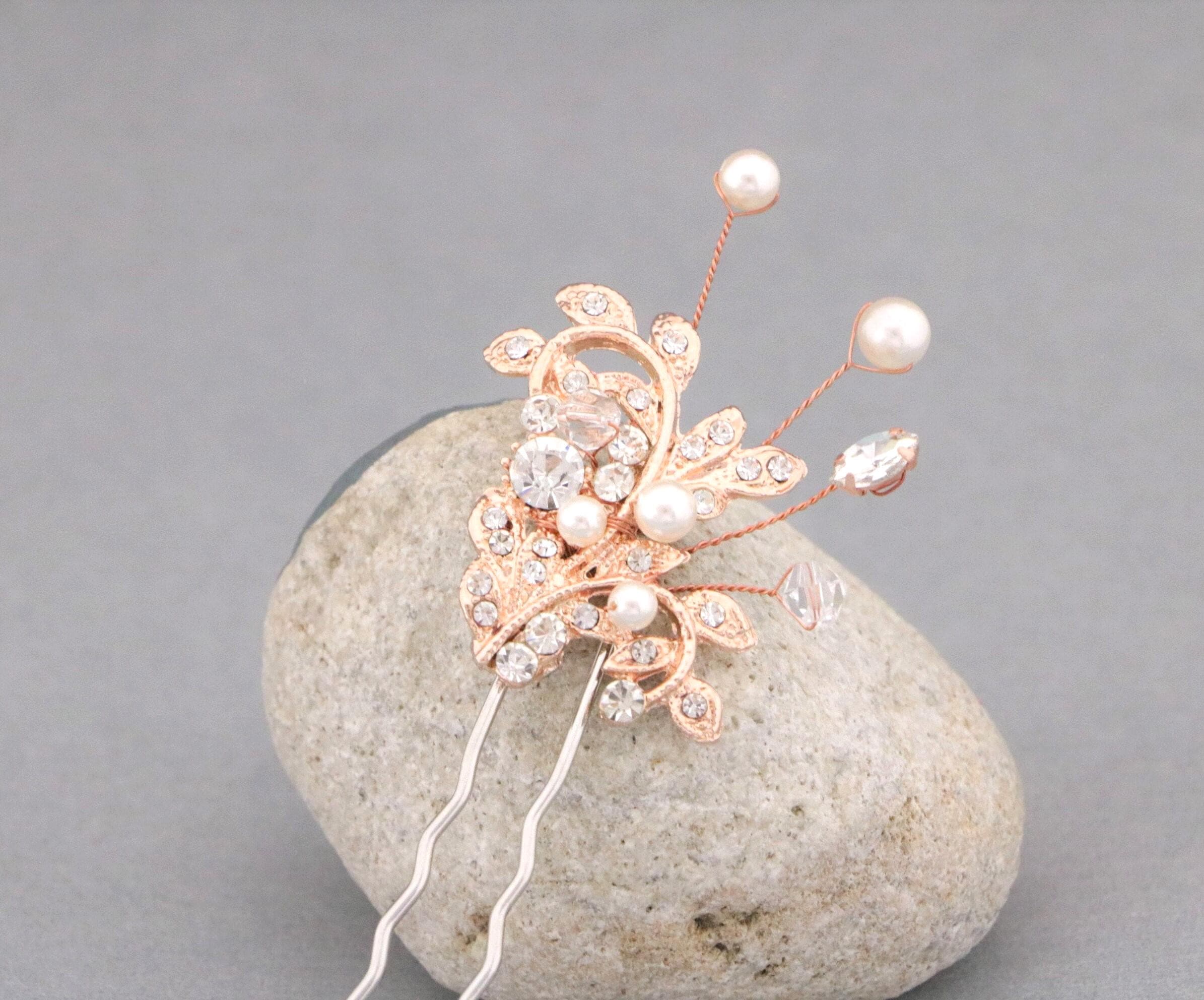 This beautiful Clear rhinestone and Rose Gold tone flower hair pin is a perfect compliment for the wedding party and can easily fit into any hair style.
