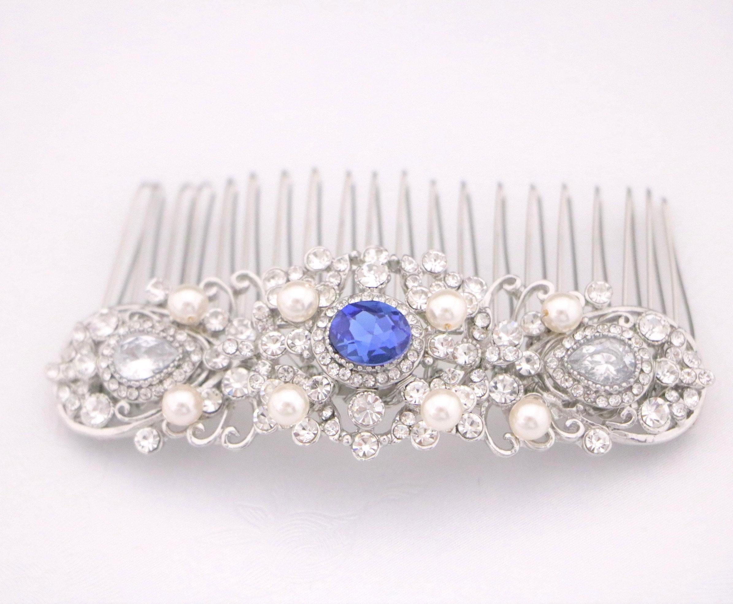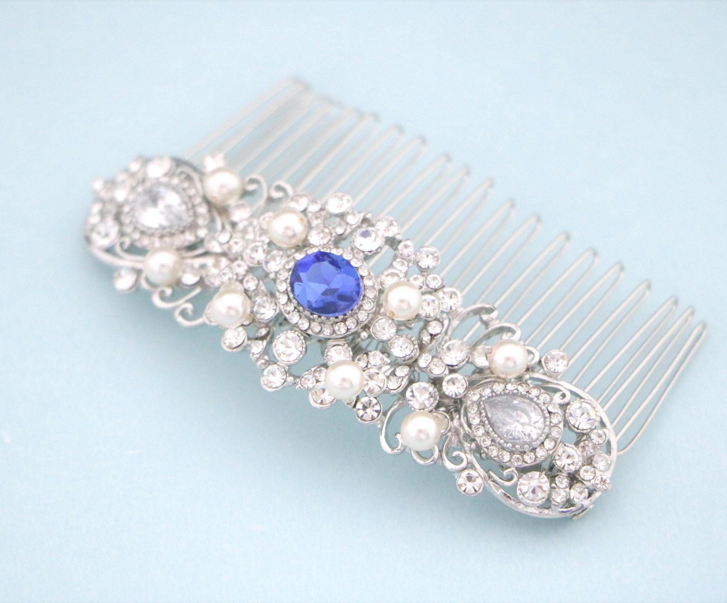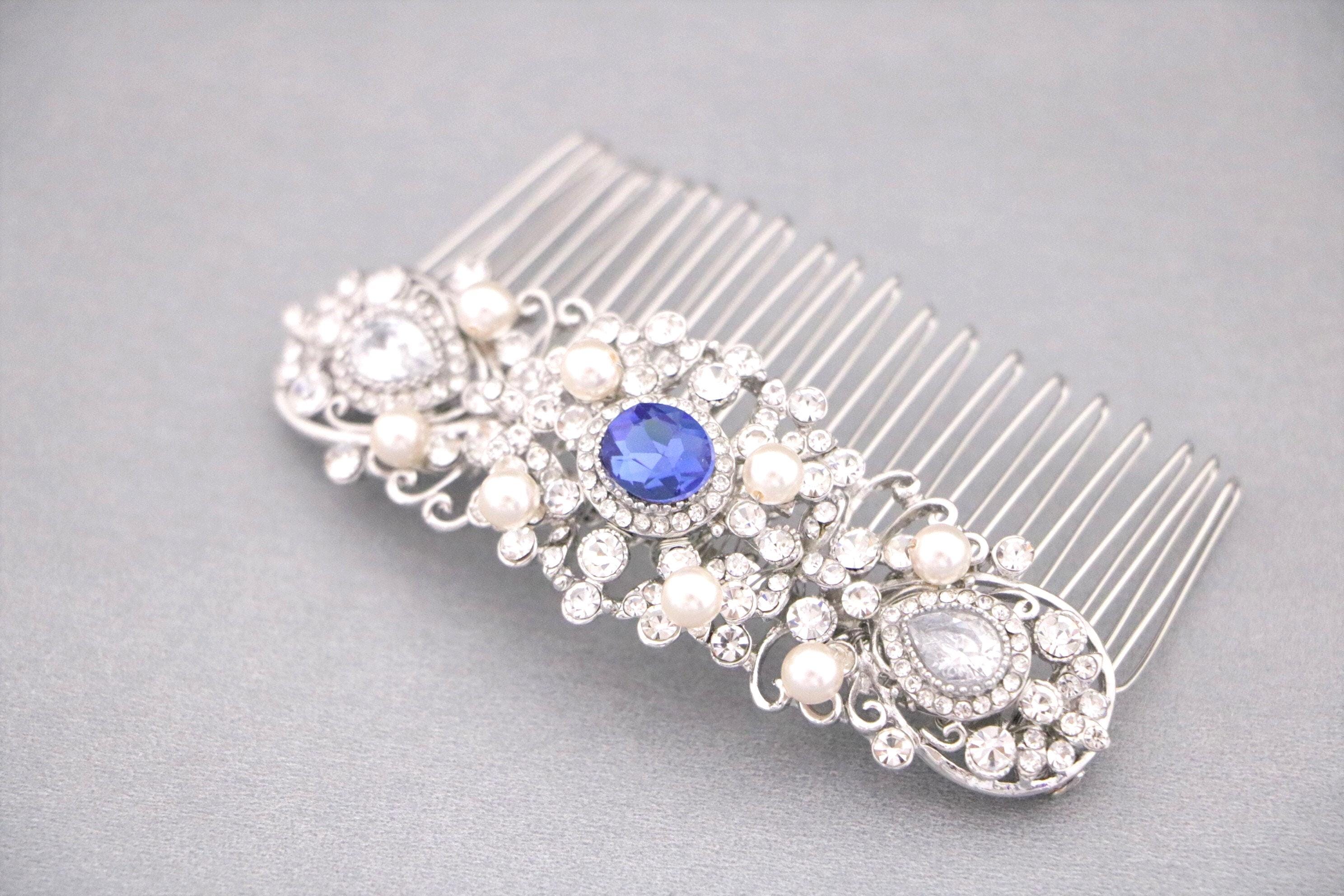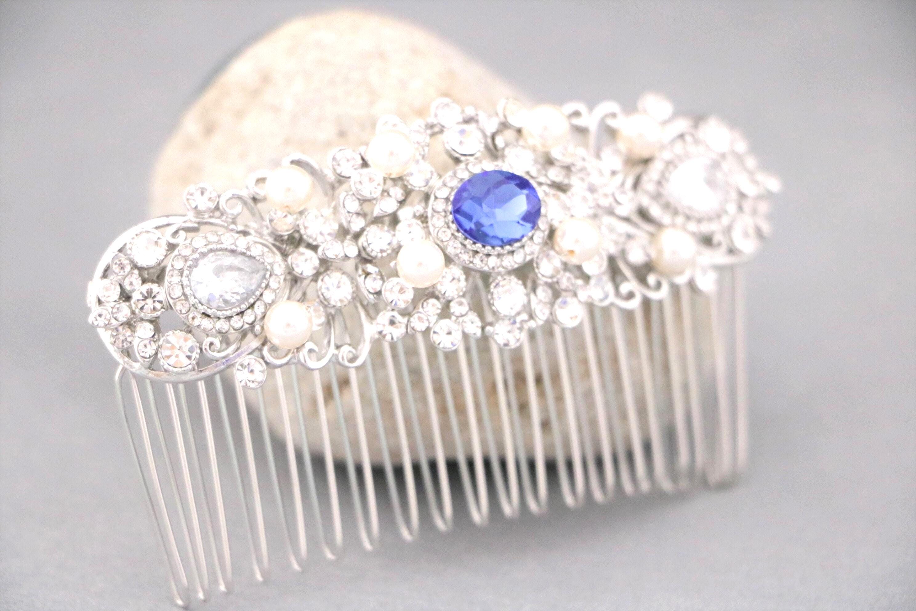 Navy Blue Pave Rhinestone Hair Comb,Sapphire Blue Rhinestone,Clear Crystal,Silver Large Ribbon Hair Comb,Bridal Hair Comb,Weddings,Art Deco