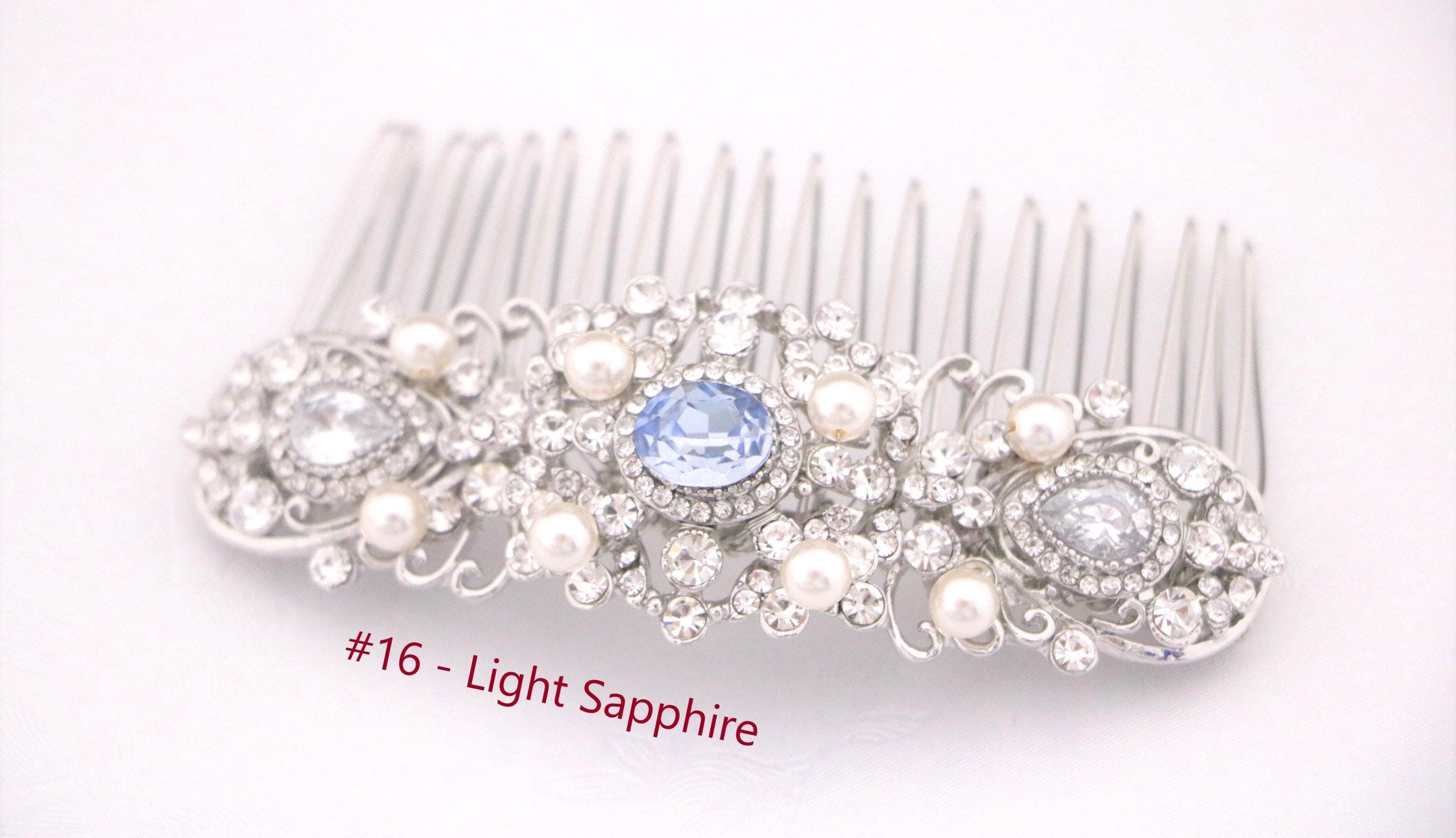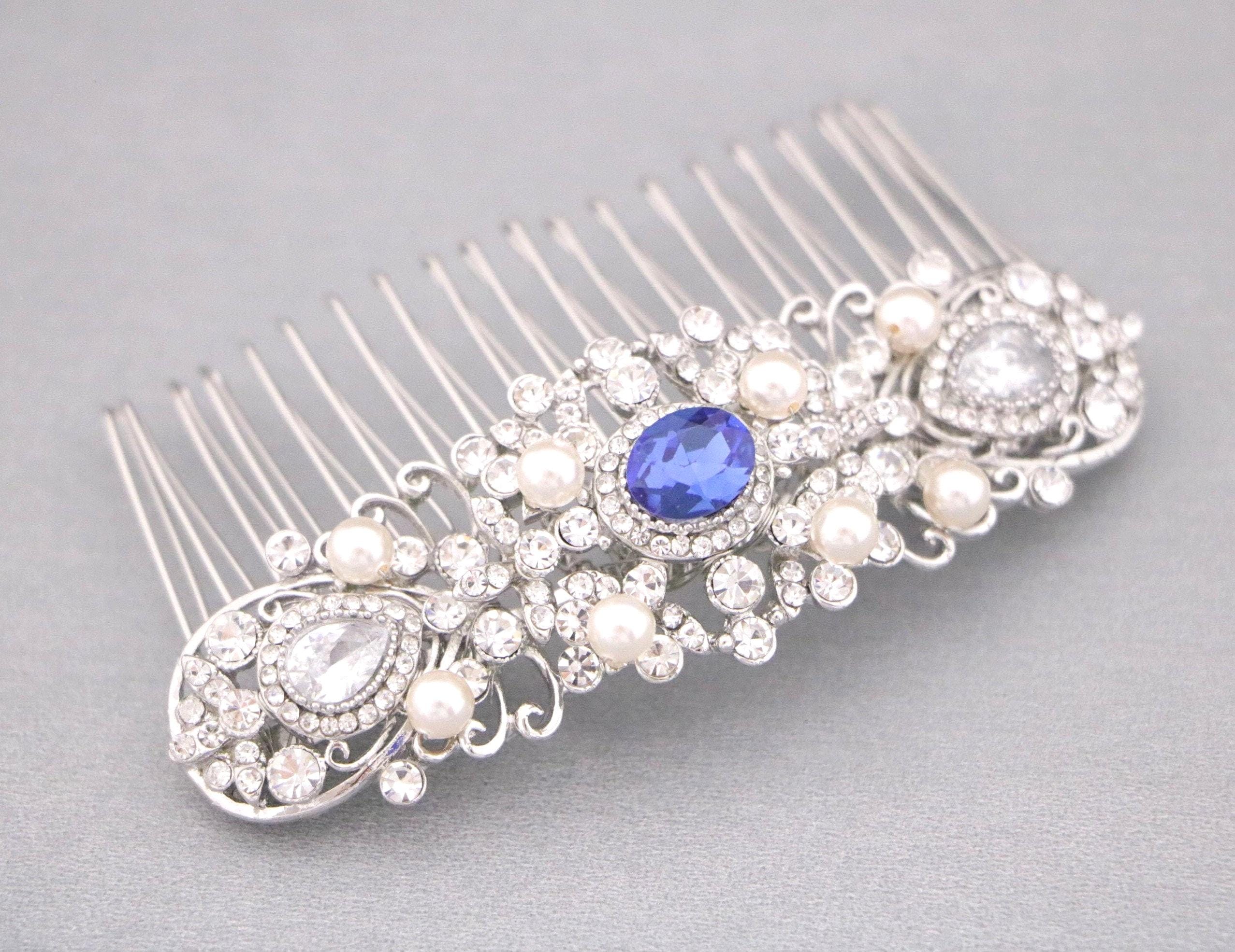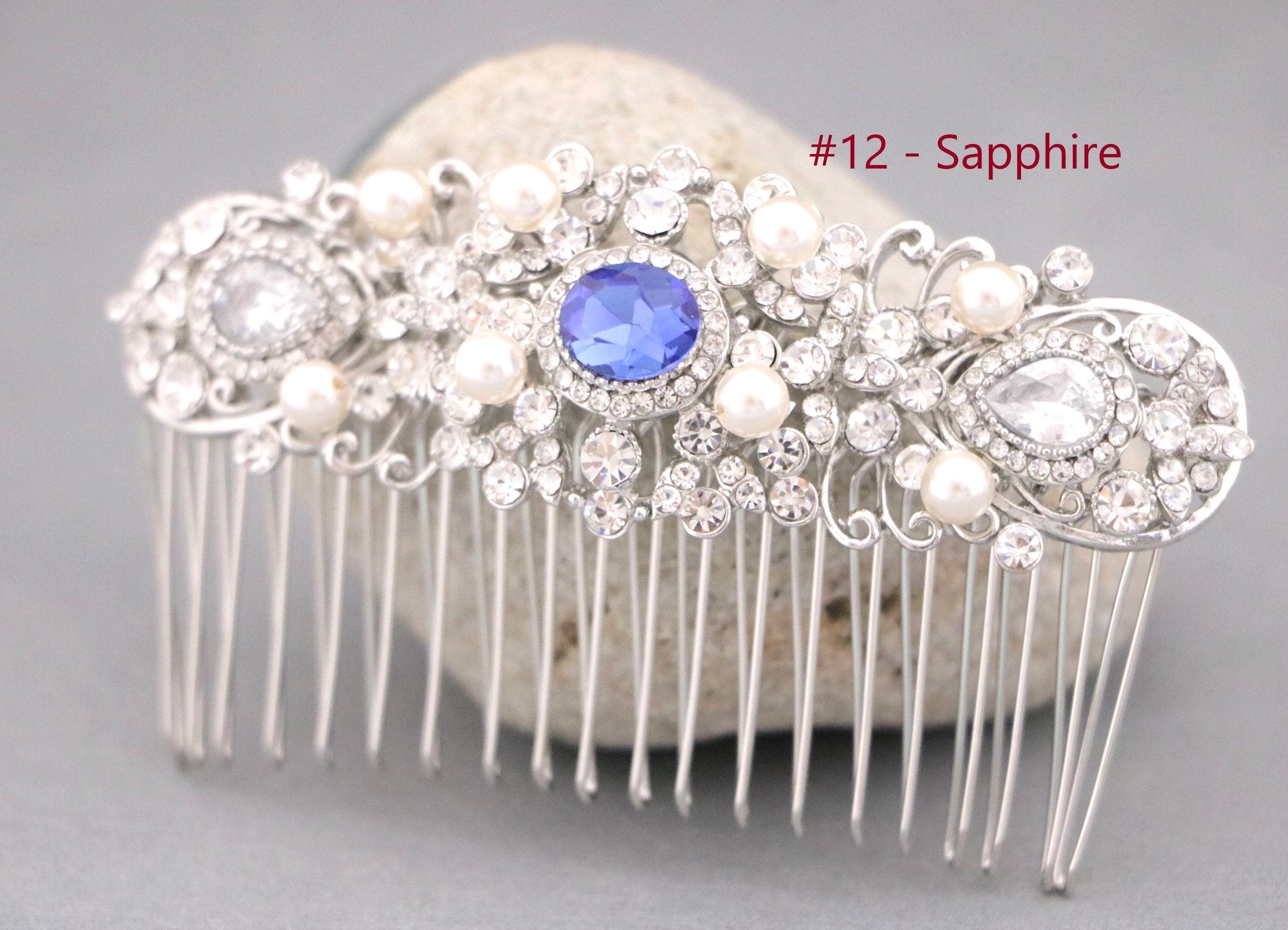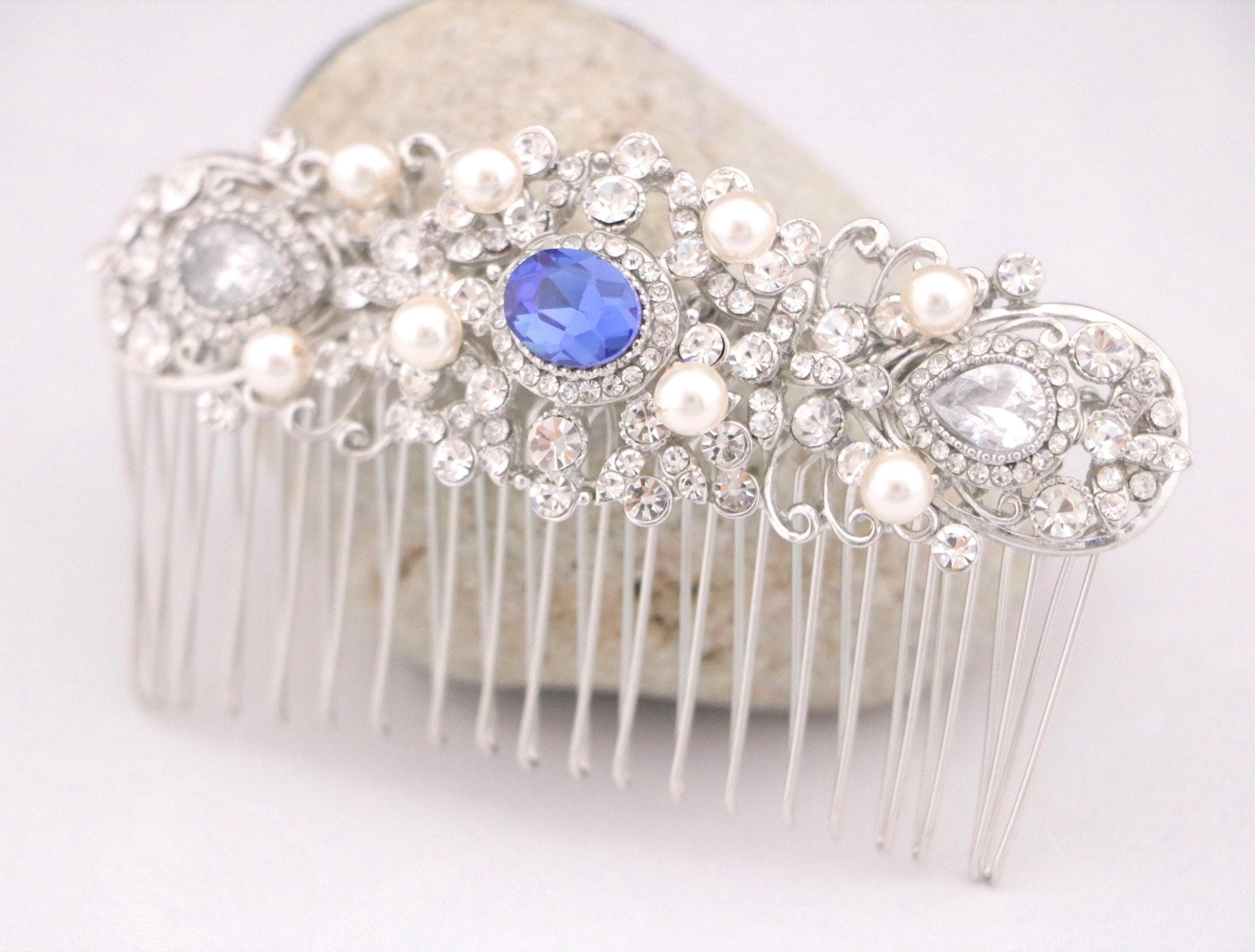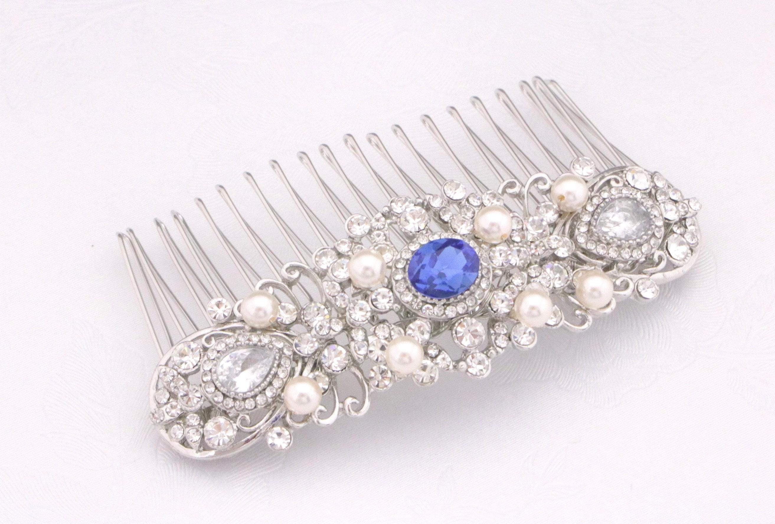 Navy Blue Pave Rhinestone Hair Comb,Sapphire Blue Rhinestone,Clear Crystal,Silver Large Ribbon Hair Comb,Bridal Hair Comb,Weddings,Art Deco