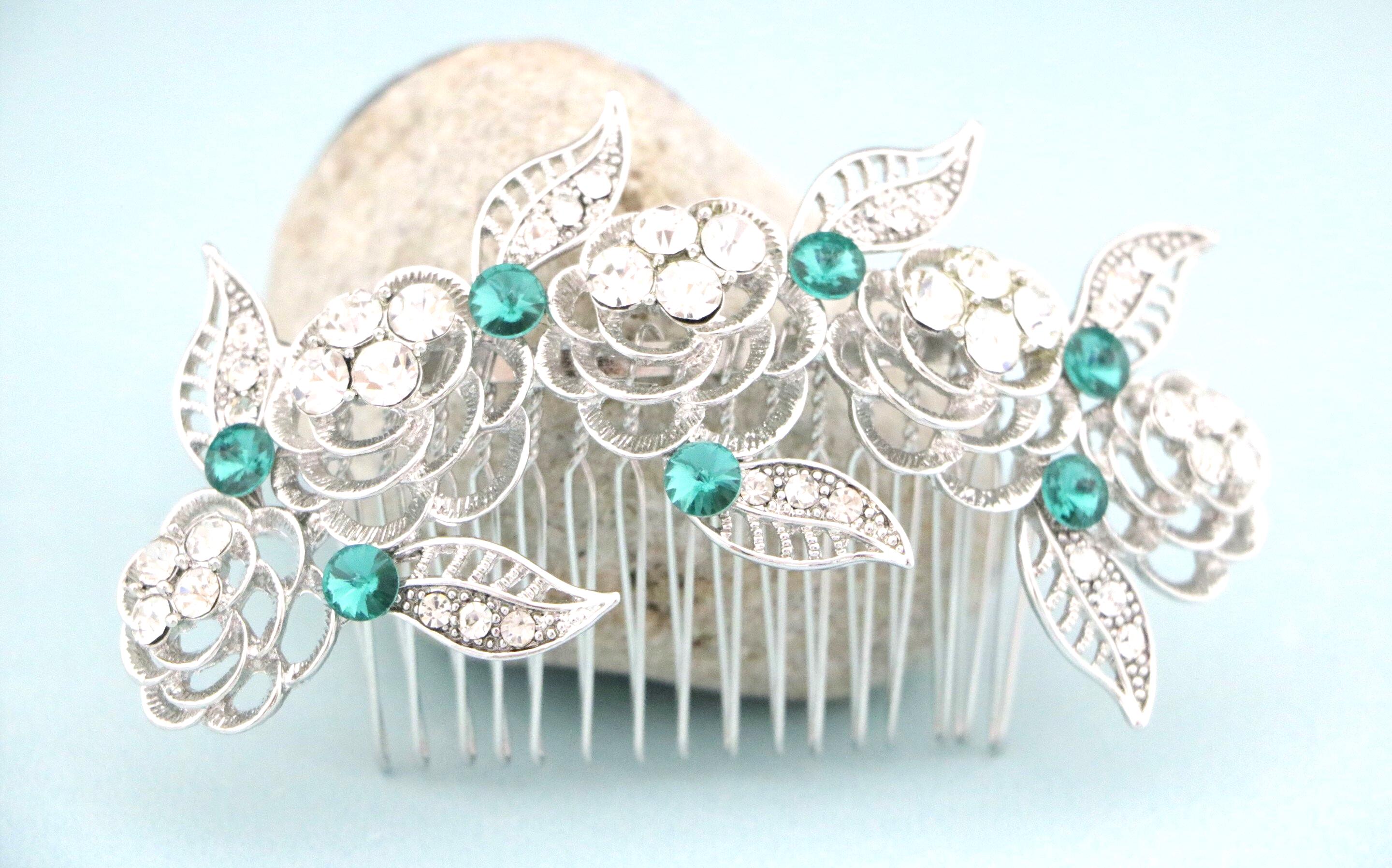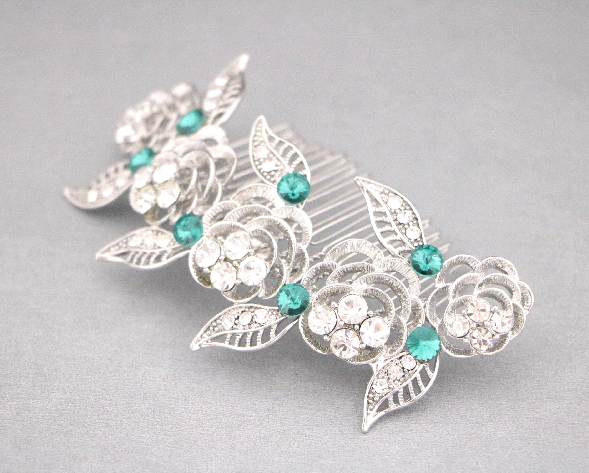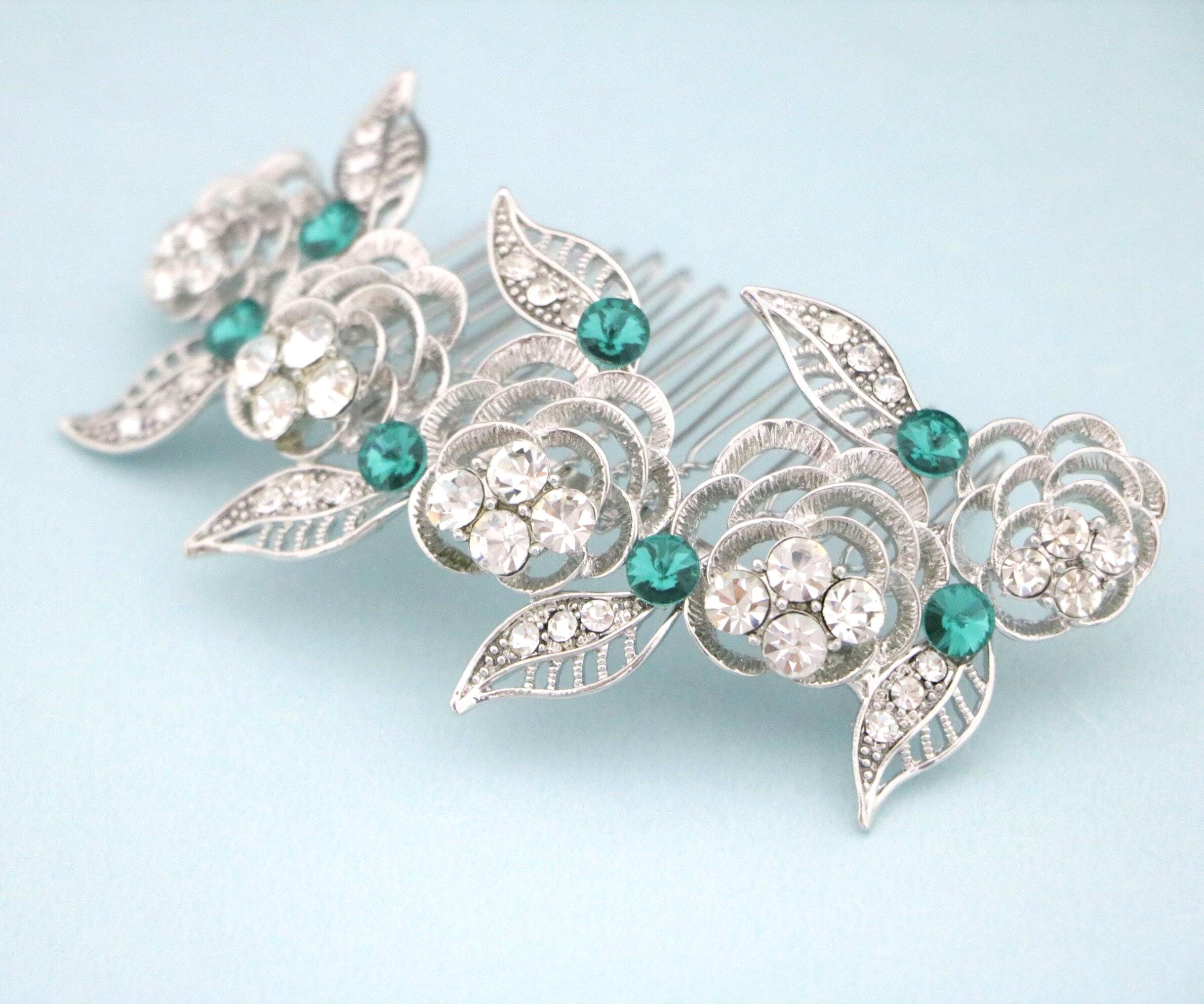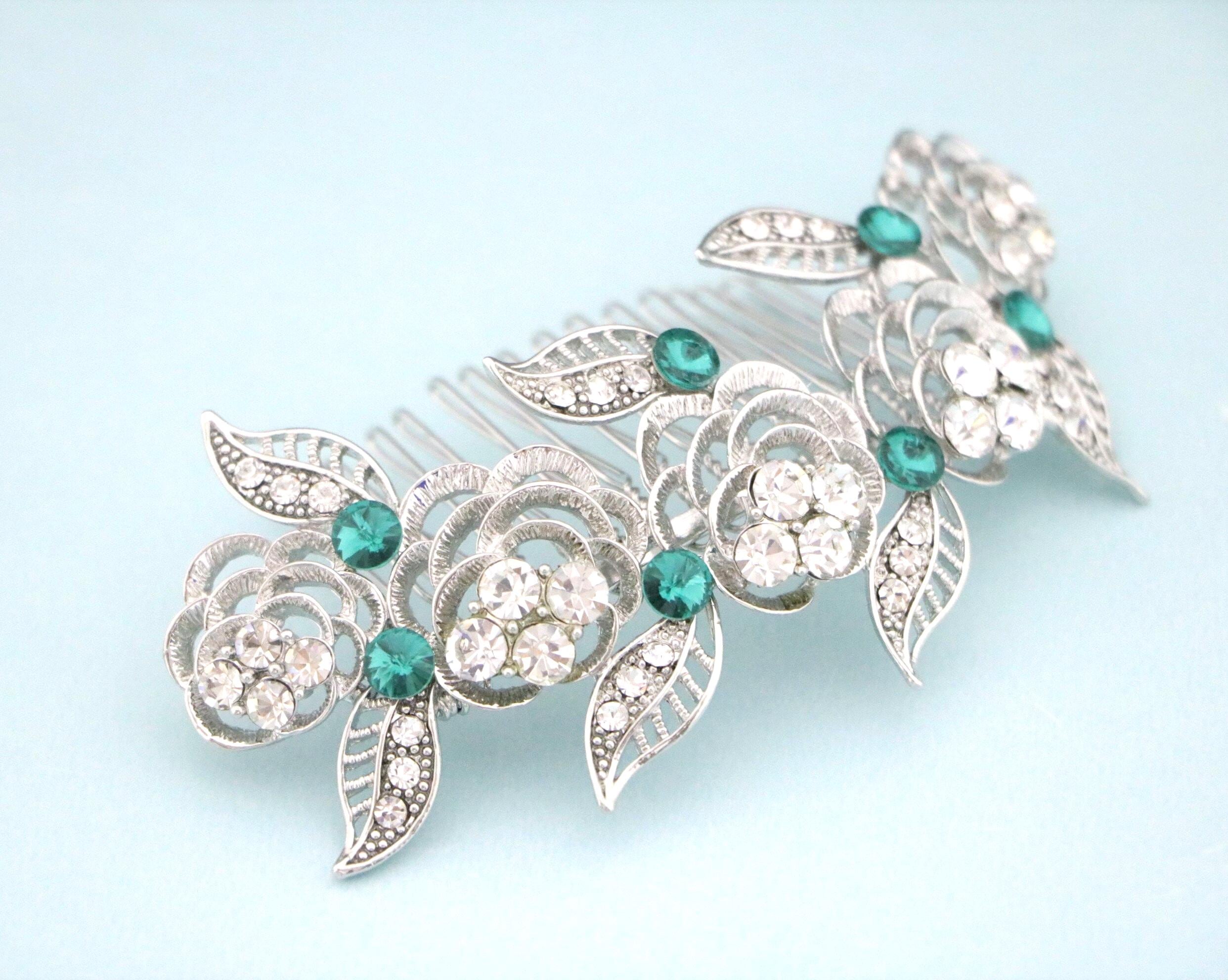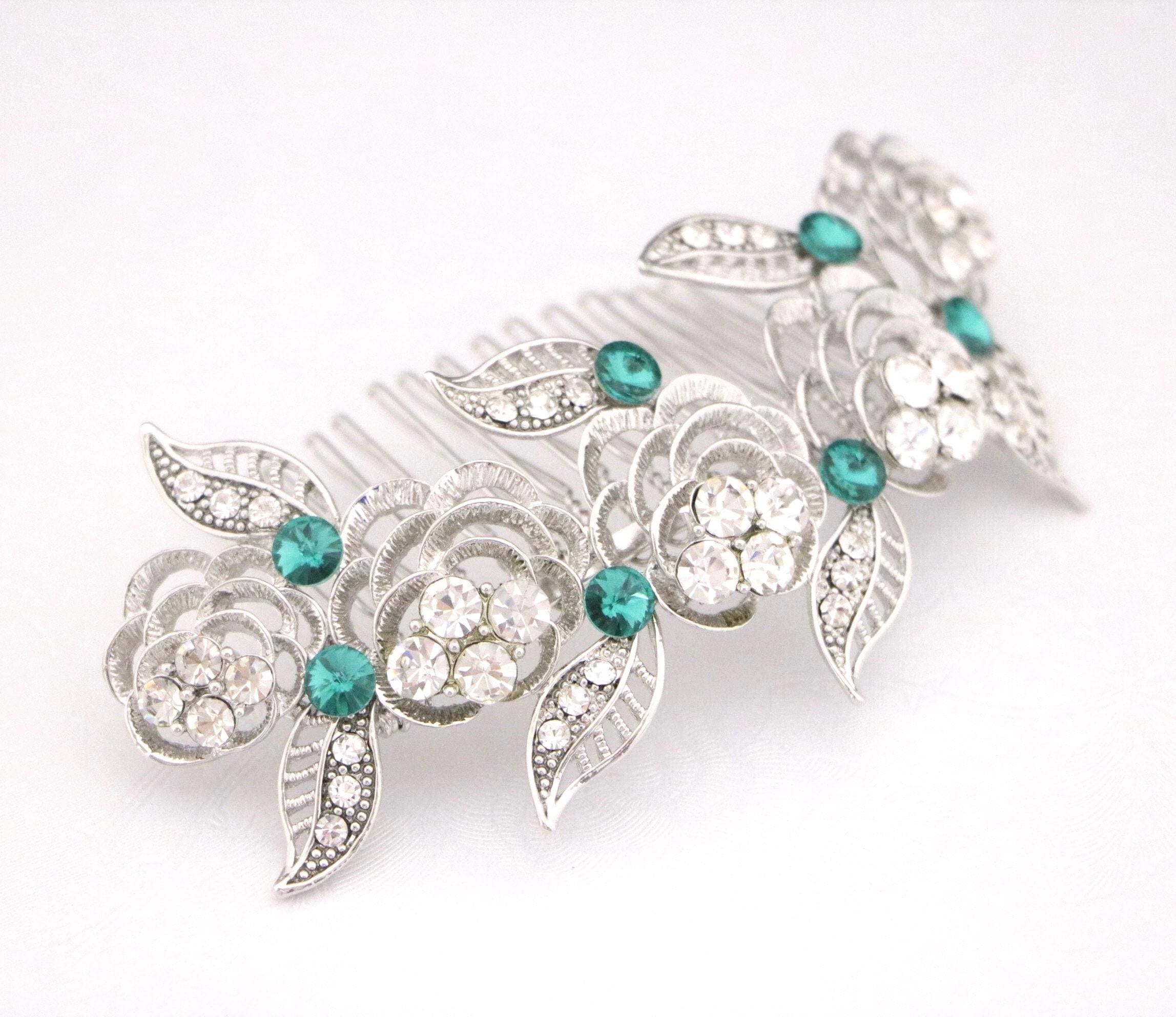 This sparkle rhinestone hair comb features a very beautiful vintage style rhinestone piece. Rhinestone piece can set on a metal barrette or on a metal hair comb. The rhinestone part measures approximately 4 X 1.25 inches.