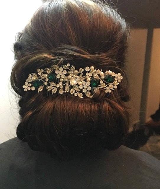 This sparkle rhinestone hair comb features a very beautiful vintage style rhinestone piece and Swarovski ivory pearls. Rhinestone piece and pearls are wired on a silver tone metal comb. The rhinestone part measures approximately 5.25 X 1.5 inches.