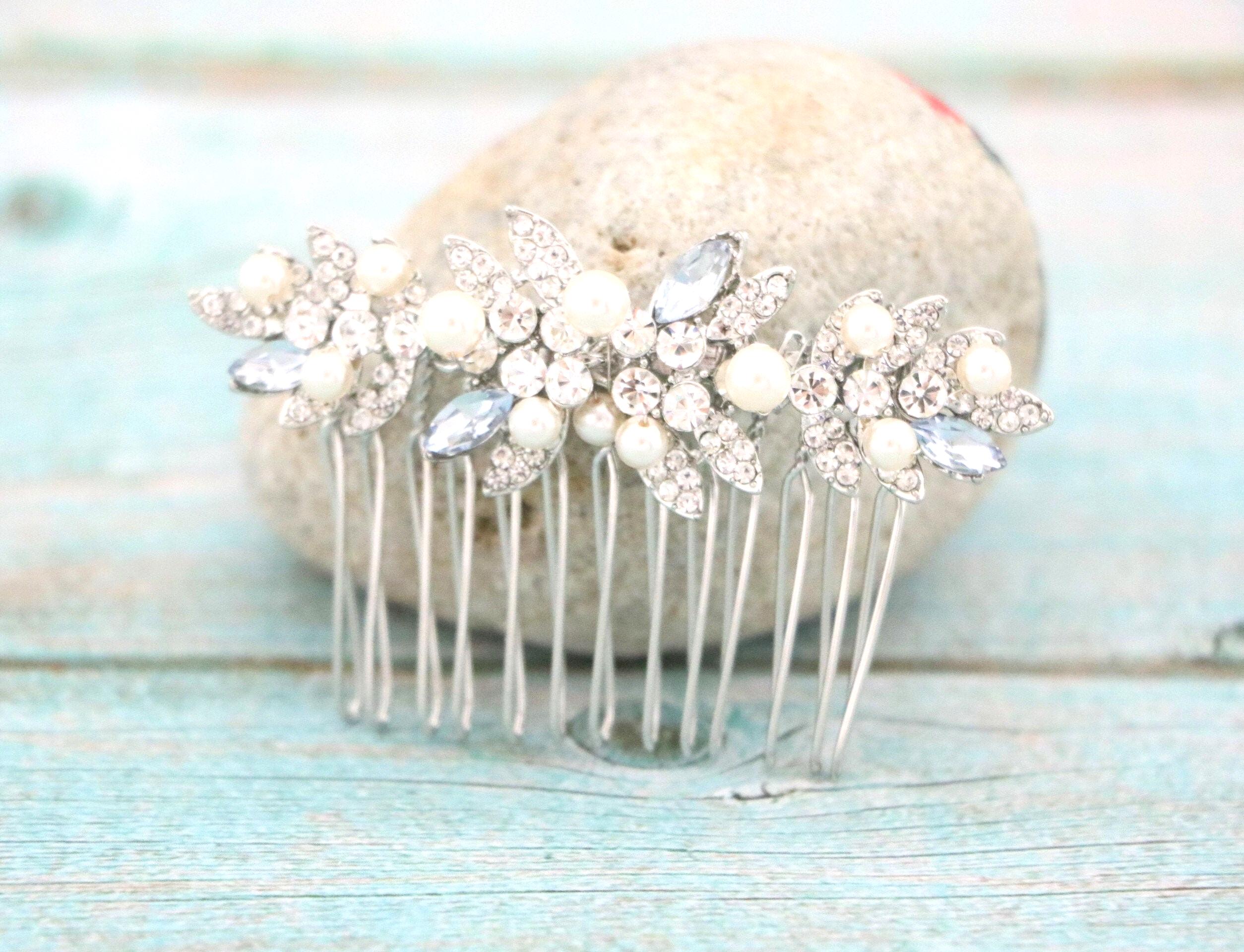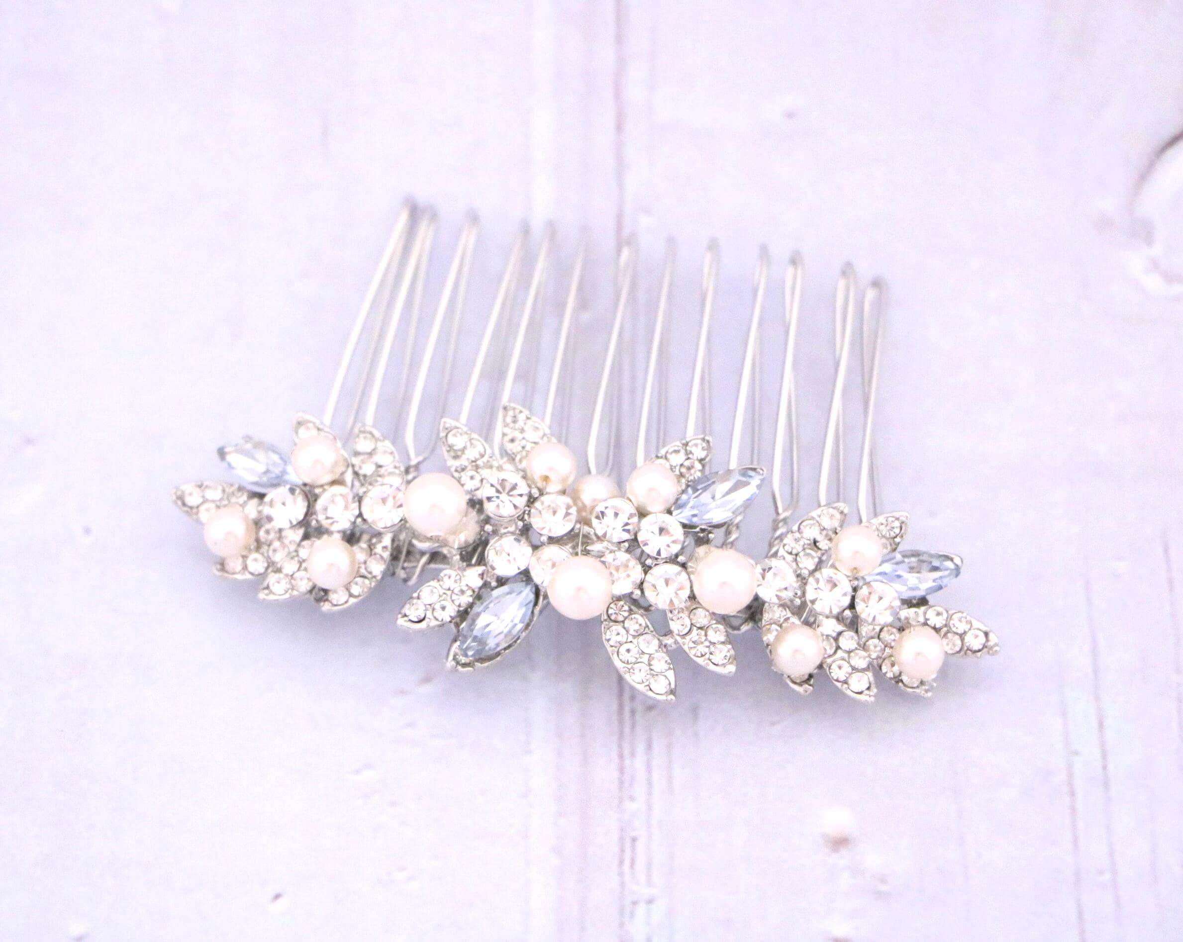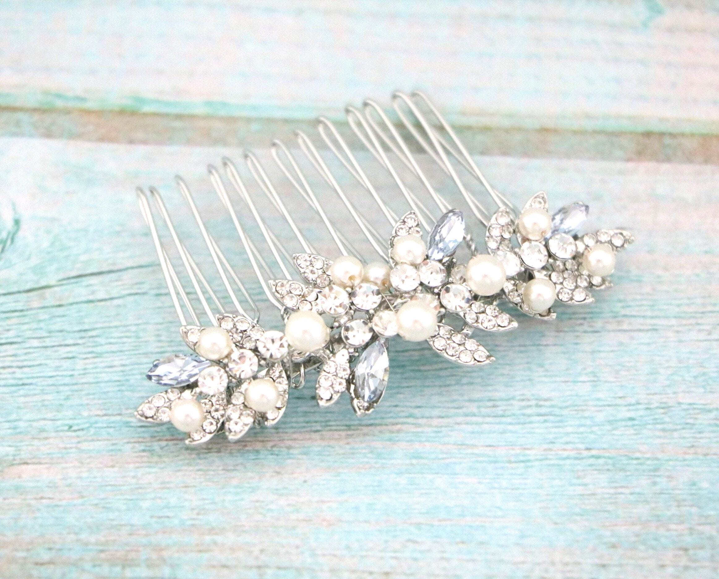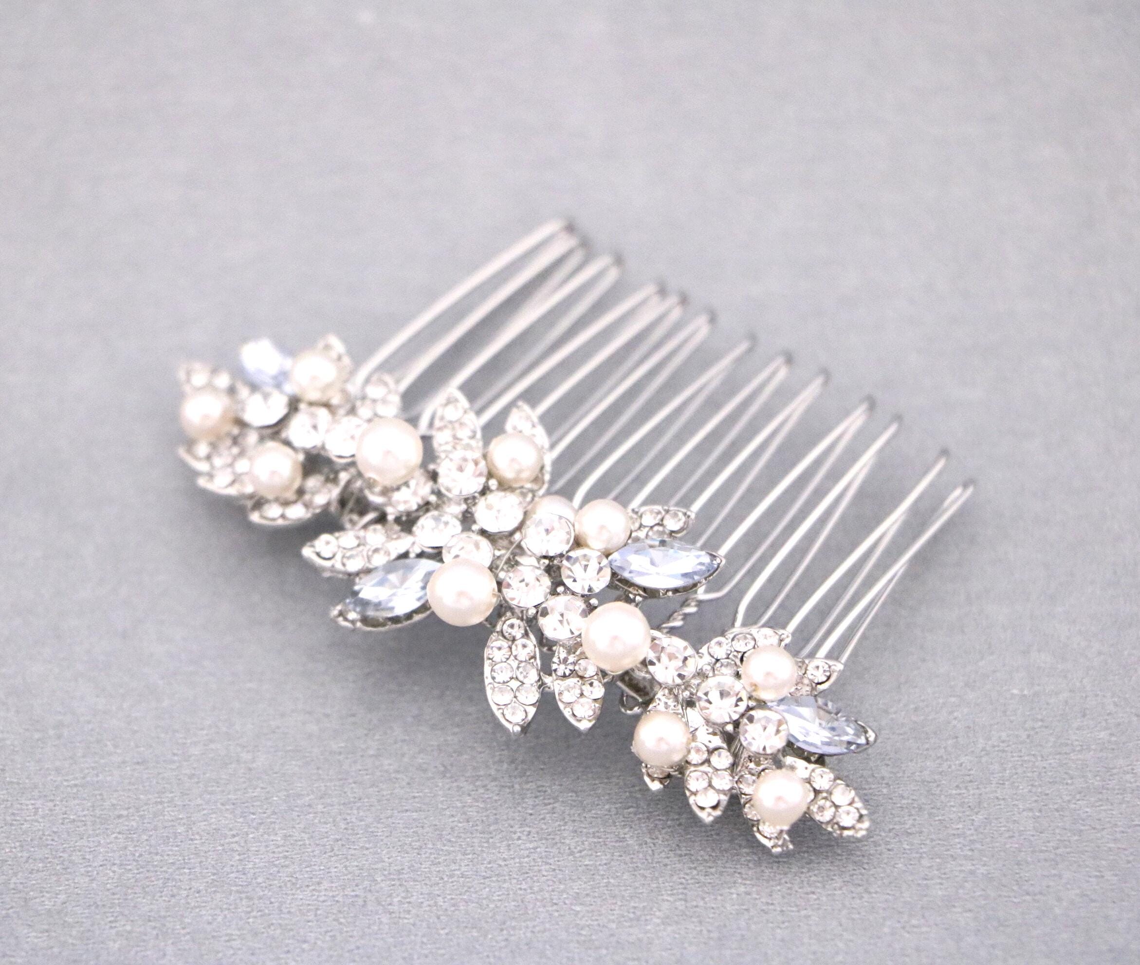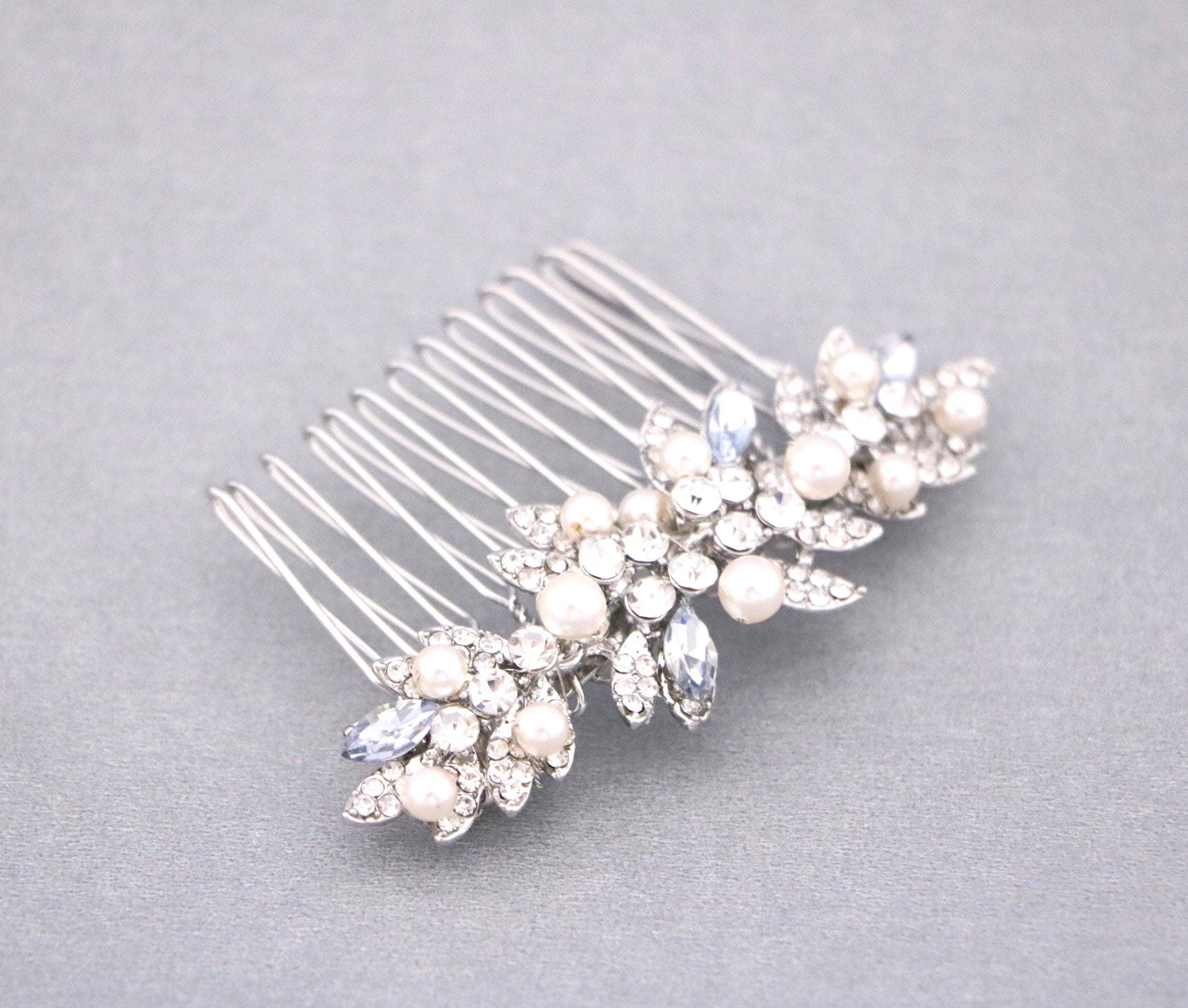 This beautiful Clear rhinestone and Montana Crystal hair comb is a perfect compliment for the wedding party and can easily fit into any hair style. The Rhinestone part measured approximately 2.75 X 1 inches.